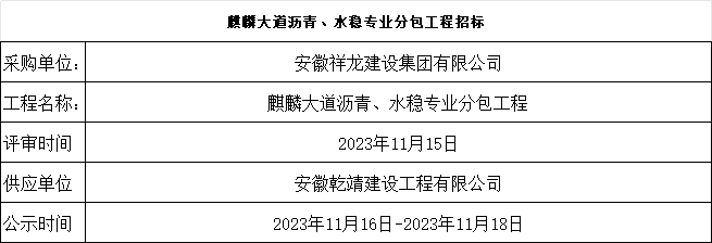 麒麟大道瀝青、水穩專業分包工程中標公示