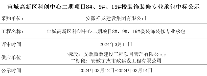 宣城高新區科創中心二期項目8#、9#、19#樓裝飾裝修專業承包中標公示
